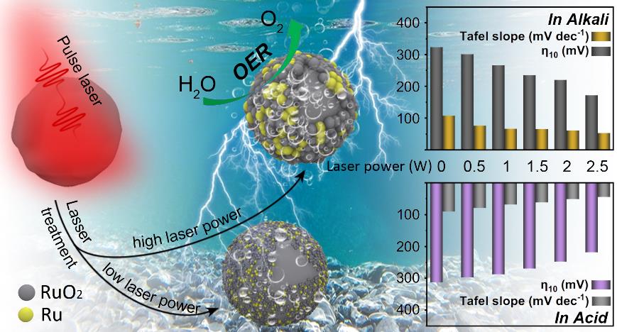 RuO2是性能最好的析氧反应电催化剂之一,然而Ru昂贵的价格大幅增加了电解水的成本。环境与能源材料研究所利用脉冲激光快速温冲法,在RuO2表面原位生长出微小的Ru/RuO2颗粒,形成独特的荔枝状形貌。这种独特的形貌可以有效增加材料的表面积,增加活性位点的负载量。同时,Ru的形成可以提高材料的导电性。在两方面的作用下,RuO2的过电位大幅减小,提高了RuO2的效率/成本比。该工作于近日发表于《Journal of Energy Chemistry》,王宗鹏博士为第一作者,钟文武教授为通讯作者,台州学院为唯一通讯单位。《Journal of Energy Chemistry》是中科院一区期刊,最新的影响因子为7.22。论文链接:https://doi.org/10.1016/j.jechem.2020.06.042。