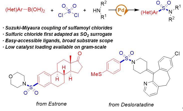 磺酰胺基团是有机化合物中磺酰基的重要存在形式之一,是许多药物和生物活性化合物中重要的骨架片段。然而,传统的磺酰胺合成路线依赖于使用相应的磺酰氯与胺反应,难以满足底物广泛性和绿色化学的要求。针对上述难题,该研究以二氯亚砜SO2Cl2为原料,通过与胺及硼酸类底物分别进行亲核取代反应及钯催化的Suzuki-Miyaura反应,成功制备了相应的磺酰胺,并且探讨了该方法在放大量合成及药物合成中的应用价值。该研究提供了一种全新的磺酰胺类化合物的合成路线,借助发展广泛的硼酸化合物库可合成多样性的磺酰胺类化合物,同时也为该领域的后续研究提供了新的方向。