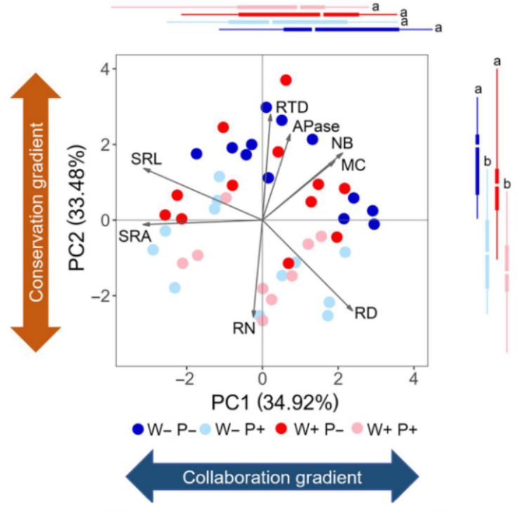 植物根系的功能性状可以分为合作维度和保守维度,并构成了根系经济谱,但是寄生植物如何调控寄主植物的根系功能特征以及在根系经济谱中的位置,目前还不清楚。该团队通过研究发现寄生植物可以通过提高保守维度上根系的氮浓度以及根组织密度,来促进寄主植物对养分的吸收利用。相关成果发表在国际知名期刊Functional Ecology上。
