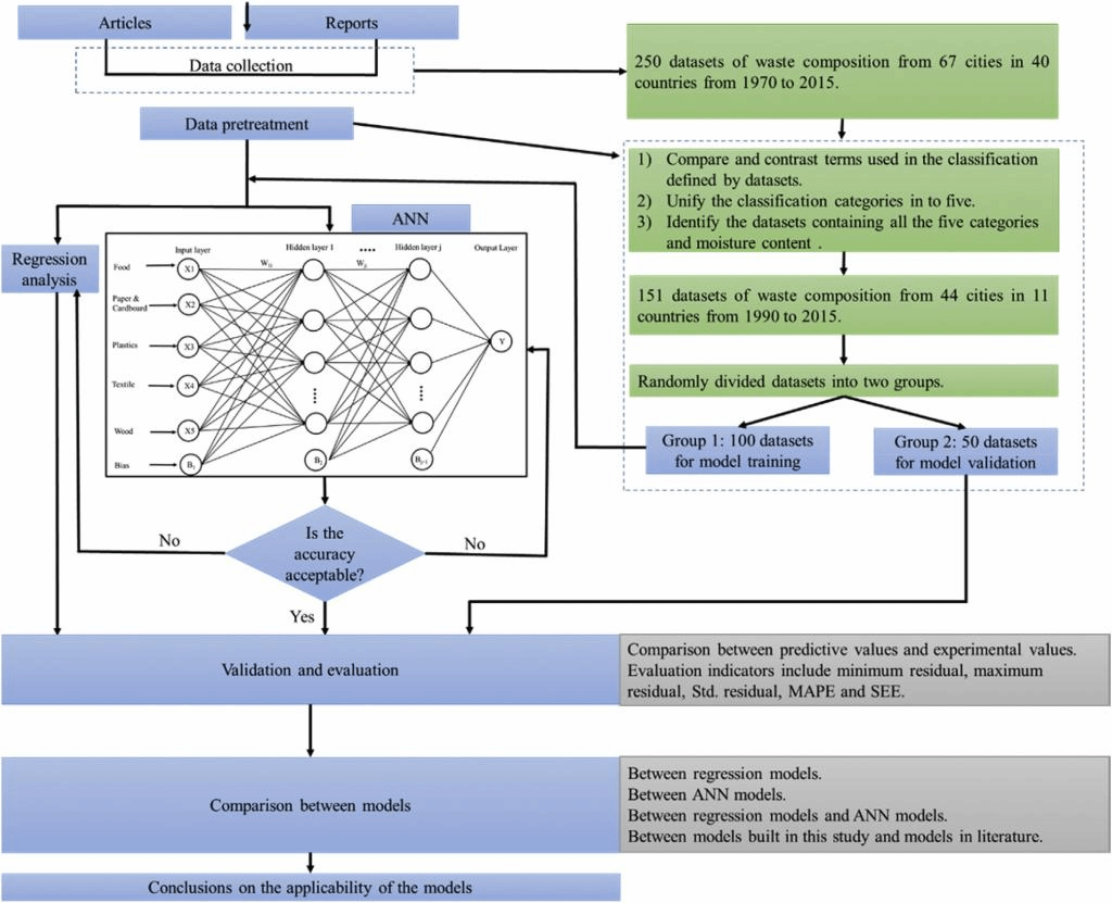 为了获得一个应用范围较广的模型,我校土壤生态与修复研究所王丹博士等研究人员收集了来自于11个国家44个城市从1990-2015年间的151组生活垃圾成分和热值的数据,利用多元线性回归和人工神经网络分别建立了生活垃圾热值的线性和非线性计算模型,模型评估指标(平均绝对百分比误差、标准平均误差等)对模型的评价结果显示该研究的模型优良,能较好的应用于大多数城市,尤其是亚洲发展中国家的城市生活垃圾热值计算。另外该研究也从理论上说明了垃圾分类,尤其是分开收集厨余垃圾,对生活垃圾资源化的重要性。该文章还对比了两种建立模型的方法(多元回归和人工神经网络)在建立生活垃圾热值计算模型中的优缺点。该工作为生活垃圾可持续管理提供了科学依据。