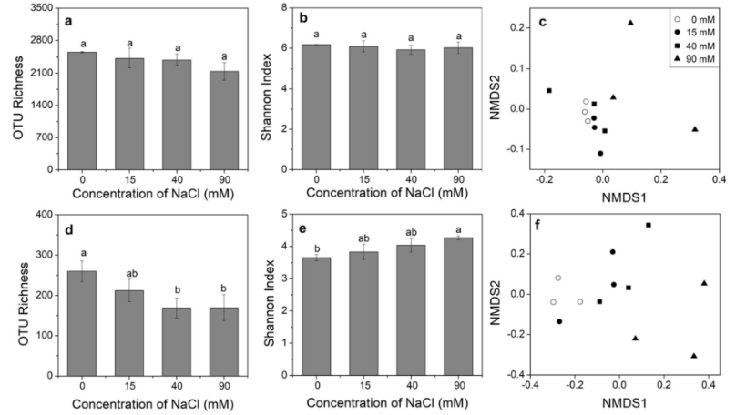 不同盐浓度下海滨木槿根际土壤细菌(a, b, c)和真菌(d, e, f)群落差异