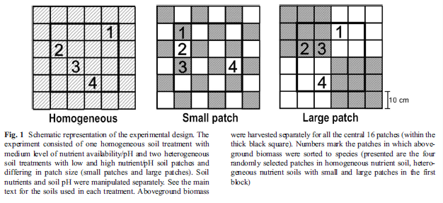 台州学院湿地与克隆生态研究所薛伟博士和荷兰生态研究所Martijn T. Bezemer教授和荷兰瓦赫宁根大学Frank Berendse教授合作,将16个物种种子的混合物均匀播撒在同质性土壤(Homogeneous),大斑块异质性土壤(Large patch)和小斑块异质性土壤中(Small patch;图1)。异质性土壤由高营养/pH和低营养/pH斑块组成,同质性土壤高营养/pH和低营养/pH土壤均匀混合而成。研究者们连续三年观测了整个群落的物种多样性以及每个斑块水平上的物种多样性。研究者们发现,整个群落水平上,土壤营养异质性和土壤pH的空间异质性对物种多样性都没有影响。斑块水平上,土壤营养异质性降低了物种多样性,土壤异质性的斑块大小对物种多样性没有影响;大斑块土壤pH异质性增加了物种多样性,而小斑块土壤pH异质性对物种多样性没有影响。群落水平以及斑块水平的物种多样性随着时间逐渐降低。因此,土样异质性对物种多样性的影响依赖于土壤因子的类型以及物种多样性和土壤异质性衡量的时空尺度。