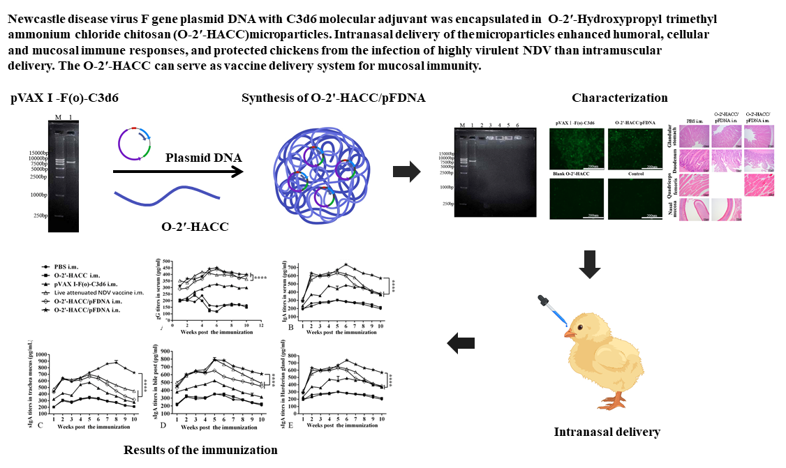 疫苗在防治人及动物传染病中起到了重要作用,但目前动物用疫苗存在免疫原性差、抗原生物利用度低、细胞免疫效果不佳、非黏膜免疫、疫苗佐剂安全性差或者效果不明显等问题。天然多糖壳聚糖纳米载体材料做为疫苗佐剂及递送载体已有报道,但壳聚糖在许多溶剂中不溶解,这在很大程度上限制了其应用范围。本团队对壳聚糖进行了化学改性,合成了水溶性好的O-2′-羟丙基三甲基氯化铵壳聚糖(O-2′-HACC)。本论文以O-2′-HACC为疫苗黏膜免疫递送载体材料,以鸡新城疫病毒(NDV)F基因真核表达质粒pVAXⅠ-F(o)-C3d6为抗原,制备了载pVAXⅠ-F(o)-C3d6 O-2′-HACC纳米疫苗(O-2ʹ-HACC/pFDNA),并对O-2ʹ-HACC/pFDNA体外释放特性、稳定性、抗DNaseⅠ降解、体内外细胞毒性、体外表达、滴鼻免疫效力及作用机制等进行了详细研究。研究结果表明,O-2′-HACC能够做为DNA疫苗佐剂及递送载体,保护了质粒DNA免受降解;O-2ʹ-HACC/pFDNA能够缓慢释放抗原,滴鼻免疫激活黏膜免疫应答反应的能力比与肌注免疫更强,诱导机体产生了高水平的IgG、SIgA、IL-2、IL-4和 IFN-γ分泌;O-2ʹ-HACC/pFDNA滴鼻免疫和肌注免疫攻毒保护率均为100%。